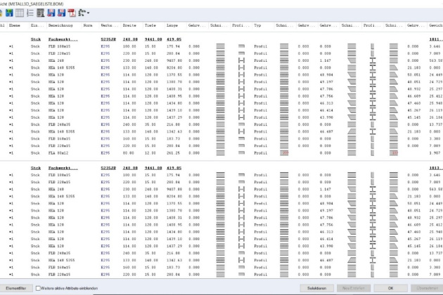 Bei der Bearbeitung bestehender Bauteile wird die Stückliste (Gewicht, Länge und Gehrungswinkel) erstellt und automatisch aktualisiert.