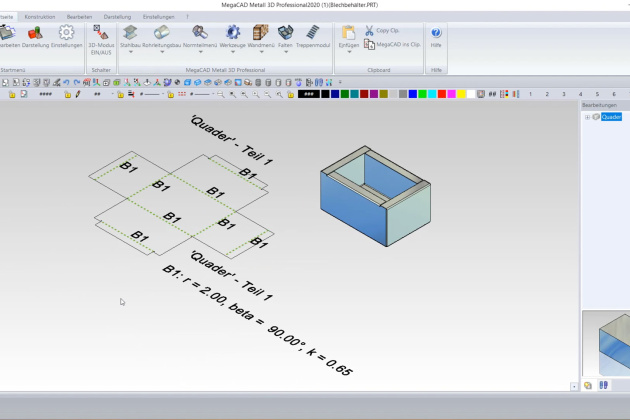 Mit MegaCAD Metall 3D Professional lassen sich auch Blechteile erstellen und bearbeiten. Erzeugen Sie Abwicklungen von Treppenwangen (auch Spindeltreppen) oder wandeln Sie bestehende Teile mit den Blechfunktionen einfach in Faltkörper um. Bei Bedarf konstruieren Sie Blechteile damit auch völlig neu. Für Anwender, die den vollen Umfang der Blechkonstruktion benötigen, empfehlen wir unsere passende Blechapplikation.