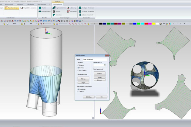 MegaCAD Profi plus bietet auch zahlreiche Funktionen, um Freiformflächen zu modellieren. Parametrik-Verknüpfung von 2D-Parametrik und 3D-Variablen. Eine 2D-Zeichnung kann ganz oder nur teilweise parametrisiert werden. Die vierdimensionale Freiheit, direktes Modellieren, wahlweise parametrisches Modellieren (auch nur teilweise oder auch nachträglich sinnvolle Teilbereiche parametrisierbar), featurebasiertes Modellieren.