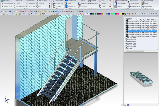 Hinzu kommt MegaCAD Metall 3D − die 3D-Software für das Metall- und Schlosserhandwerk. Die Bedienung des Programms ist sehr komfortabel. 2D-Zeichnungen werden mit wenigen Klicks in 3D-Modelle überführt und visualisiert. Auch eine 3D-Direkteingabe ist möglich. Regelkörper wie Quader, Zylinder und Pyramiden können dabei direkt, d. h. auch ohne 2D-Skizze erstellt und per Mausklick modifiziert werden. Von der gesamten Konstruktion lassen sich mit wenigen Klicks Zusammenbauzeichnungen, Fertigungszeichnungen und eine 3D-Visualisierung erzeugen und ausdrucken.