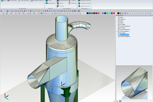 Unter der Überschrift „Mehr Effizienz bei der Blechbearbeitung“ wird am Messestand außerdem MegaCAD USF Blechpaket vorgestellt. Das Programm gewährleistet einen schnellen und zuverlässigen Herstellungsprozess: vom Design des Blechkörpers über die automatische Abwicklung der Bleche bis hin zur Fertigungszeichnung. Leistungsfähige Funktionen und durchdachte Konstruktionswerkzeuge sind hier unter einer intuitiv bedienbaren Oberfläche vereint. Das freie und direkte Konstruieren ermöglicht die zügige Erstellung aller nur denkbaren Sonderformen für den Behälter- und Rohrleitungsbau, den chemischen Apparatebau und für die Heizungs- und Klimatechnik. Produktionstechnische Erfordernisse werden schon während der Konstruktion erkannt und selbstständig Lösungen dafür angeboten.