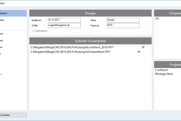 In der Benutzerverwaltung werden Dateien und Verzeichnisse Benutzer zugeordnet. Weiterhin legt man hier Projekte und Bearbeitungsgruppen je nach Bedarf fest. Über diese Optionen in der Benutzerverwaltung kann man die Bearbeitung seiner CAD-Dateien über eine Rechteverwaltung und einer klaren Strukturierung verwalten.