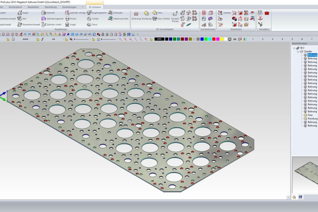 Beispiel: Ein Lochblech (147 MB) mit hunderten von Bohrungen wurde ohne Informationsverlust auf 14 MB optimiert, indem gleichartige Bohrungen zu Sets zusammengefasst wurden.