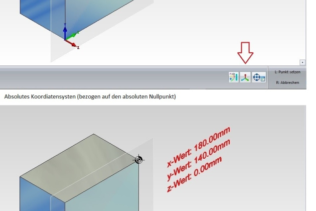 Bei der Ausgabe der Koordinaten eines Punktes kann mit Hilfe einer Statuszeilenschaltfläche zwischen absoluten Koordinaten und Koordinaten bezogen auf die aktive Arbeitsebene umgeschaltet werden. Diese Erweiterung bedeutet in der Praxis, dass jetzt ein Wechsel zwischen dem absoluten Koordinatensystem und der Koordinatenausgabe bezogen zum Nullpunkt der Arbeitsebene möglich ist.