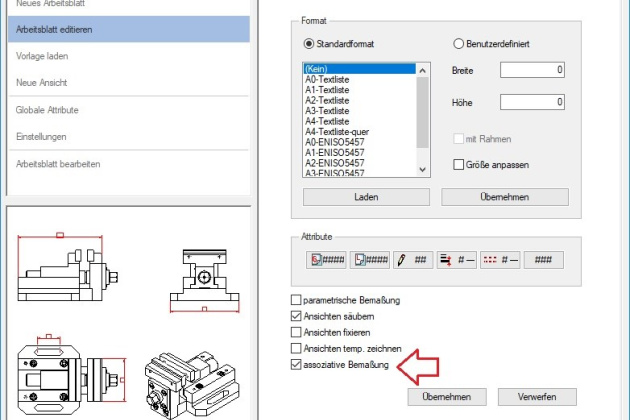 Die Maße im Arbeitsblatt werden jetzt nach Änderungen im Modellbereich automatisch angepasst. Dazu muss der Schalter “assoziative Bemaßung” (Registerkarte “Neues Arbeitsblatt”) aktiv sein. Falls nicht, werden die Maße nach der alten Methode aktualisiert (wenn der Elementbezug aktiv ist).