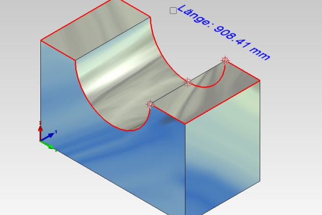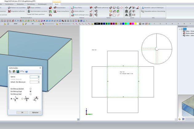 Wenn die Eckklinkung einer aufgeschnittenen Kante dadurch erzeugt wird, dass eine Kugel abgezogen wird (Eckklinkung Kugel), dann wird dieser Ausschnitt beim Abwickeln in eine 2D Zeichnung zu einer kreisförmigen Klinkung korrigiert. Dadurch wird die Außenkontur des Blechs für den Laserzuschnitt optimiert. Der Halbkreisdurchmesser wird dabei automatisch so gewählt, dass die Biegezone gerade komplett geklinkt wird, korreliert also direkt mit dem Innenbiegeradius.