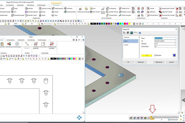 Über zwei neue Optionen unten rechts in der Statuszeile können entweder alle Bohrungen mit gleicher Ausrichtung oder alle Bohrungen mit gleichem Durchmesser selektiert werden.