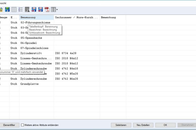 Bei mehrfacher Verwendung einer Positionsnummer werden die Positionsnummern rot dargestellt. Ein Tooltip weist darauf hin, dass die Positionsnummer mehrfach verwendet wird. Die Felder des Tabellenkopfes zeigen in einem Tooltip den Bezeichner aus der Tabellenvorlage, den Bezeichner des Attributes, sowie den Stücklistenschlüssel an.