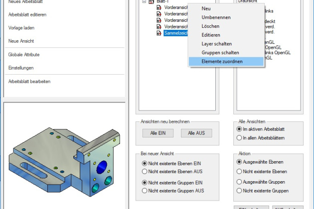 Neuer Befehl im Ansicht-Kontextmenu: „Elemente zuordnen“ zur Erstellung von Sammelzeichnungen. Es können pro Ansicht neue Elemente selektiert (oder bereits zugeordnete abgewählt) werden. Nur diese Elemente werden in der Ansicht dargestellt. Die Layer- / Gruppen-Schaltung wird nicht berücksichtigt. Definiert man andersherum eine neue Layer- / Gruppen-Schaltung, dann wird eine ggf. vorhandene Elementzuordnung aufgehoben.