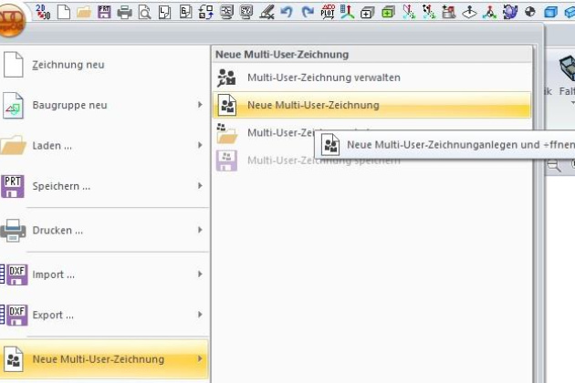 Um eine solche Multi-User-Zeichnung zu definieren, muss mindestens ein Benutzer in der Benutzerverwaltung angelegt sein! Ist ein Benutzer angelegt, stehen im Dateimenü Funktionen zum Arbeiten mit Multi-User-Zeichnungen zur Verfügung.
