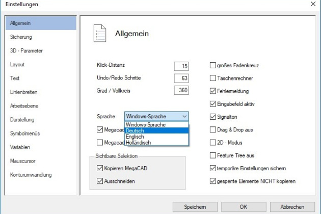 Umschalten der Sprache (Deutsch / Englisch) zur Laufzeit bei MegaCAD 2019 Lt, 2D und 3D.