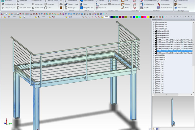 Hinzu kommt MegaCAD Metall 3D − die 3D-Software für das Metall- und Schlosserhandwerk. Die Bedienung des Programms ist sehr komfortabel. 2D-Zeichnungen werden mit wenigen Klicks in 3D-Modelle überführt und visualisiert. Auch eine 3D-Direkteingabe ist möglich. Regelkörper wie Quader, Zylinder und Pyramiden können dabei direkt, d. h. auch ohne 2D-Skizze erstellt und per Mausklick modifiziert werden. Von der gesamten Konstruktion lassen sich mit wenigen Klicks Zusammenbauzeichnungen, Fertigungszeichnungen und eine 3D-Visualisierung erzeugen und ausdrucken.