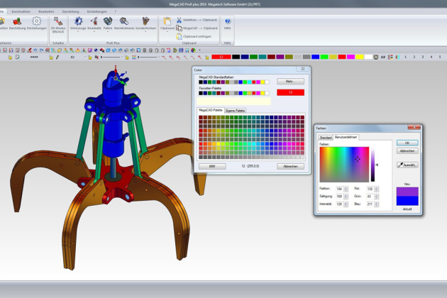 Die Überarbeitung der neuen Version wird dem Anwender gleich beim Öffnen vor Augen geführt. Denn das neue Startmenü von MegaCAD 2014 fasst alle Hauptfunktionen übersichtlich zusammen. So gelangt man schnell und auf direktem Wege in die gewünschten Untermenüs. Der Umstieg auf True Color macht es außerdem möglich, die Modelle nach Belieben zu kolorieren. 16,7 Mio. Farben stehen hierfür zur Verfügung.